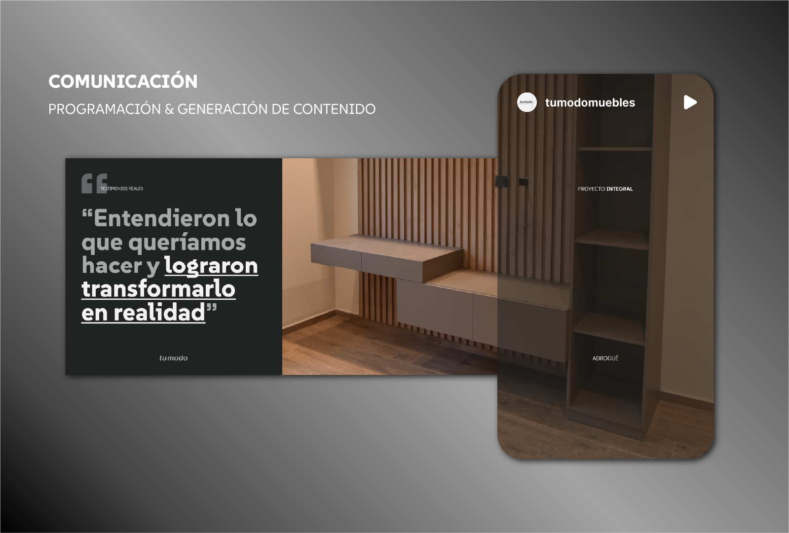 Se trabajó en la construcción de un sistema visual más sólido y contemporáneo, capaz de reflejar el nivel de sus proyectos y acompañar su proyección. La propuesta pone el foco en la claridad formal, la jerarquía de la información y una estética alineada con el carácter arquitectónico de sus productos. Como parte del desarrollo, se realizó la dirección de arte y producción fotográfica en locación, generando un banco de imágenes propio que muestra los muebles en uso real y en contexto, reforzando la percepción de calidad y funcionalidad. El proyecto incluyó además el diseño y desarrollo del sitio web, concebido como una extensión del sistema de marca, donde conviven contenido, producto y servicio bajo una misma lógica visual.El resultado es una identidad coherente y escalable, que acompaña el crecimiento de la marca y potencia su posicionamiento dentro del segmento de mobiliario a medida.